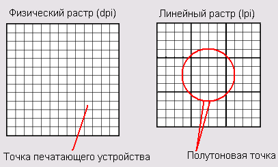 Рис. 1.9. Физический и линейный растры. Совокупность соседних точек физического растра образует полутоновую ячейку, которая является логической единицей в офсетной печати
