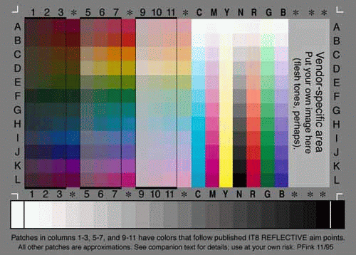 Информация об оптическом диапазоне доступна не для всех моделей сканеров. Трудно объяснить это иными причинами, чем низкое значение этого важного показателя даже у популярных марок от самых именитых производителей. Приблизительную оценку оптического диапазона можно получить посредством простого вычислительного эксперимента. Требуется отсканировать эталонное печатное изображение и оценить полученные результаты в области самых светлых и темных тонов. Эталоном в принципе может быть любая картинка с широкой цветовой гаммой и полным тоновым диапазоном, отпечатанная с высоким качеством на фотобумаге. В качестве стандарта, принятого международной организацией по стандартизации (ISO), используются мишени IT8. Это печатный образец, представляющий эталонные цвета различной яркости и насыщенности и оттенки серого цвета. Стандартом фиксируется только часть содержимого мишени, значительный ее остаток не регламентируется и может быть выбран по усмотрению производителя.