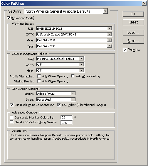 - Settings (Параметры). Этот раздел содержит список заранее определенных цветовых параметров, предназначенных для типичных проектных ситуаций, например подготовки графики для публикации во Всемирной сети, или стандартные установки для предпечатной подготовки изображения в Европе или Америке.