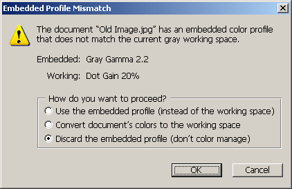 - Discard the embedded profile (don't color management). Отбрасывает информацию о профиле. В этом случае изображение обрабатывается программой как нетегированное. Числовые значения цвета остаются без изменений, а на экране компьютера они представляются в соответствии с текущим профилем редактора.