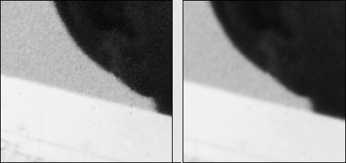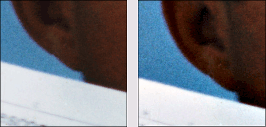 Рис. 3.27. Состояние синего канала до и после обработки. Изображение увеличено в четыре раза