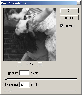 2. Запустим фильтр Dust & Scratches и в его диалоговом окне подберем параметры, ликвидирующие все мелкие дефекты в левом верхнем углу фотографии. Состояние царапин при этом можно не принимать во внимание. Параметры фильтра, решающие поставленную задачу, показаны на рис. 3.36.