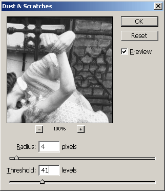 5. Еще раз вызовем фильтр Dust & Scratches и подберем такие настройки, которые удаляют длинные белые царапины с правой стороны снимка (см. рис. 3.37).