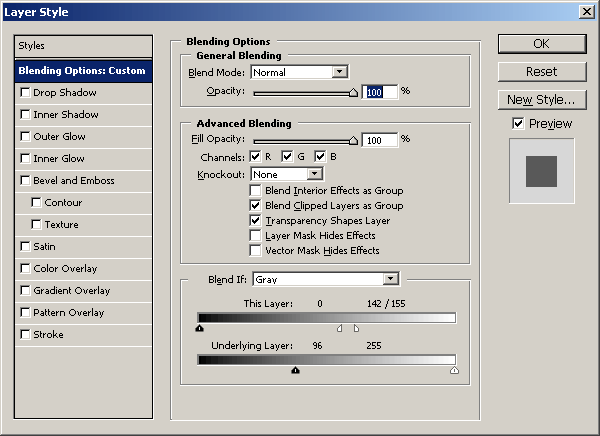 Underlying Layer (Нижележащий слой) задает визуализацию нижнего слоя. В результирующее изображение войдут все точки верхнего слоя, яркость которых находится в пределах, заданных белым и черным регуляторами шкалы This Layer. Например, если заданы граничные значения 20 и 155, то будут отброшены все точки верхнего слоя, яркость которых меньше 20 и больше 155. Для шкалы