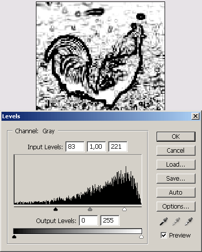 4. Настроим тоновый уровень стилизованного изображения таким образом, чтобы подчеркнуть границы повреждений. Для этого воспользуемся штатным средством настройки тонов программы - командой