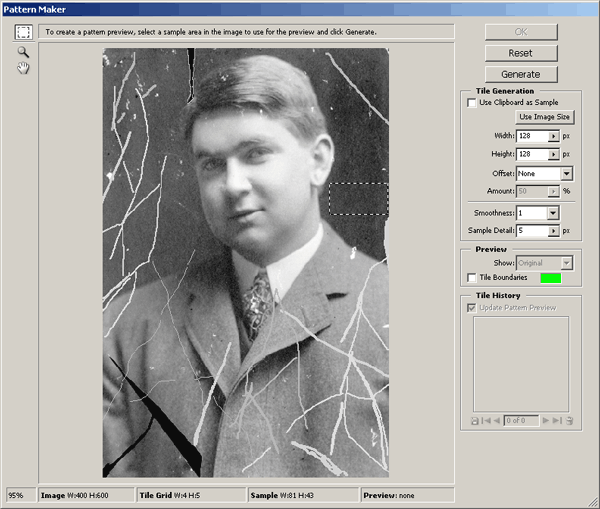 Ключевая идея метода состоит в выборе донорских областей. Для этого на оригинале следует выбрать фрагмент, который по своей текстуре подобен поврежденным областям. Чтобы добиться хороших результатов, иногда приходится провести предварительную обработку донорской области клонирующим штампом или исправляющей кистью. Далее на основе исправленного образца создается текстура. После подбора параметров текстуры и ее сохранения она становится доступной для всех рисующих и корректирующих инструментов редактора. Созданная текстура, взятая в качестве образца для инструментов