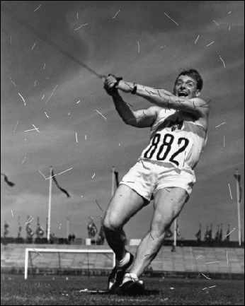 На рис. 3.21 показана старая фотография, существенно пострадавшая от множества царапин различного размера, хаотично заполняющих почти все пространство снимка. Если с дефектами на фоне еще можно мириться, то серые полосы и точки на руках бросаются в глаза и существенно ухудшают качество снимка.