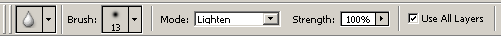 Use All Layers (Использовать все слои), выберем режим наложения Lighten (Осветление) и зададим половинный нажим кисти (рис. 3.22). Режим осветления используется для сокрытия дефектов черного цвета; обработку светлых царапин и пыли следует выполнять в режиме