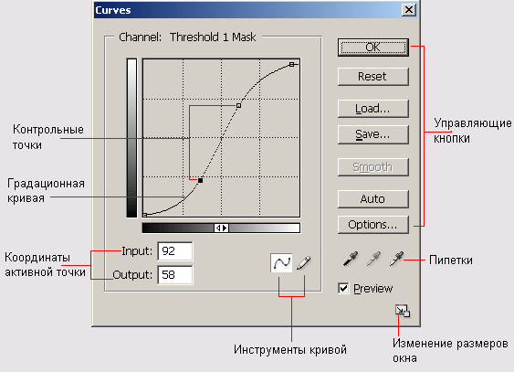 Eyedropper. Если щелкнуть им по изображению, то на кривой появится точка, соответствующая выбранному оригиналу, в полях