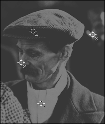 Для контроля цветового смещения следует расставить на снимке несколько цветовых датчиков. Они должны давать информацию о сдвиге тонов на самых важных и чувствительных фрагментах фотографии. Эта самая освещенная часть лица, светлые области рубашки, темные фрагменты шляпы и блики на изображении фона (см. рис. 4.63). Напомним, что расстановка цветовых датчиков выполняется при помощи инструмента
