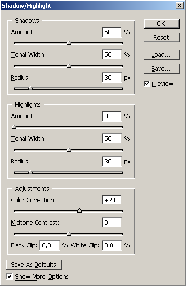 - Radius (Радиус). Задает размеры области, в пределах которой определяется статус точек изображения. Области тени и света не определяются в абсолютных цифрах. Объявить точку светлой или темной можно только на основе сравнения ее с пикселами окружения. С ростом радиуса область действия команды расширяется, при предельных его значениях команда воздействует на все изображение. Оптимальное значение радиуса подбирается опытным путем, на основе тестовых испытаний каждого оригинала.