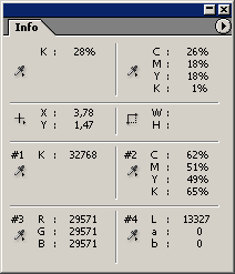 Info отображаются цветовые координаты текущей точки. По умолчанию выводятся величины интенсивностей цветовых каналов в модели RGB и процентное значение красок в модели CMYK, но этот выбор не окончательный и его можно изменить. Палитра