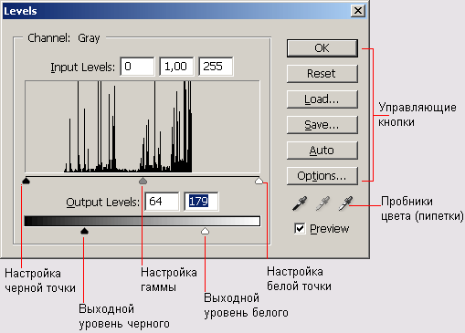 - Ползунки черного и белого цвета служат для перестройки тонов изображения. Техника работы с регуляторами подробно обсуждается в следующих разделах данной главы.