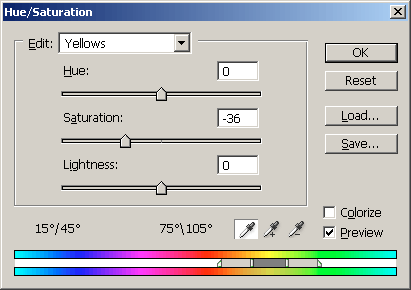 Передвинем средний ползунок, отвечающий за параметр Saturation (Насыщенность), в левую сторону. Это приведет к снижению интенсивности желтой составляющей во всем изображении. Выбрать такую позицию регулятора (рис. 5.25), которая обеспечит пропорции основных цветовых координат, укладывающиеся в допуск для смуглой кожи лиц европейского типа.