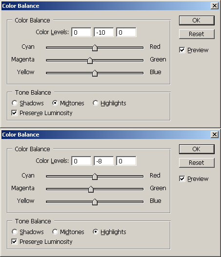 Color Balance (Цветовой баланс). Его способ цветокоррекции основан на изменении соотношения комплиментарных цветов. Так, для уменьшения доли зеленого инструмент усилит вклад его дополнительного цвета - пурпурного. Это благоприятно скажется на цветовом балансе всего оригинала, поскольку в области лица долю пурпурной краски следует увеличить.