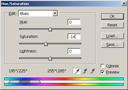 Edit выберем пункт Blues. После этого передвинем регулятор Saturation, отвечающий за насыщенность, в левую сторону. Ранее было установлено, что его оптимальное значение равно примерно - 14. Новый корректирующий слой после своего создания автоматически получит маску, которая по своей форме полностью совпадает с построенным выделением. Черные области маски защищены от любых изменений, ее белые части открыты для команды, а серые фрагменты воспринимают все воздействия в промежуточной степени, в зависимости от близости к одному из граничных цветов.