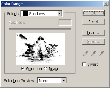 2. Выделим на изображении область темных тонов. Эта почти неразрешимая задача для обычных инструментов выделения имеет в пакете Photoshop простое и эффективное решение. Для этого надо выполнить команду