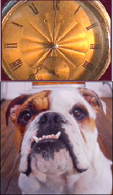 Возьмем в качестве примера два изображения, показанные на рис. 6.27, и вставим под стекло секундомера фотографию симпатичного пса. Будем считать, что исходные изображения разнесены по разным слоям и образ пса отделен от окружающего фона.