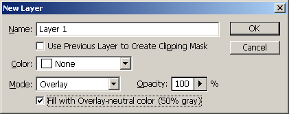 2. В диалоговом окне New Layer выберем для нового слоя режим наложения Overlay и активизируем опцию Fill with Overlay-neutral color (50 % gray). В результате он будет закрашен 50%-ным серым цветом.