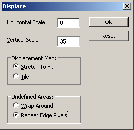 11. Обработать слой с тенью фильтром Displace (Смещение). Для этого выполнить команду Filter => Distort => Displace (Фильтр => Искажение => Смещение). В диалоговом окне (рис. 6.67) задать нулевую величину горизонтального смещения и смещение по вертикали, примерно равное 35 %. В общем случае, оптимальное смещение тени можно подобрать только опытным путем. Для остальных параметров фильтра задать такие значения, которые показаны в диалоговом окне.