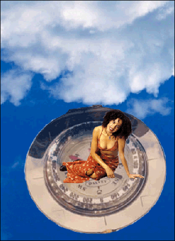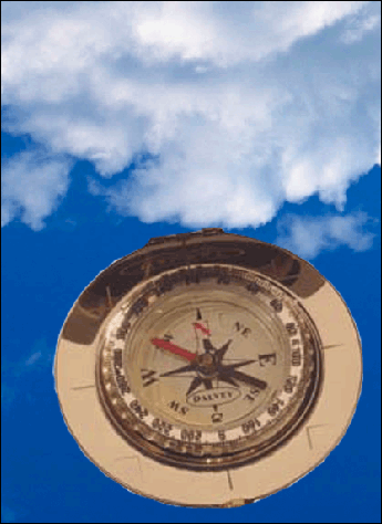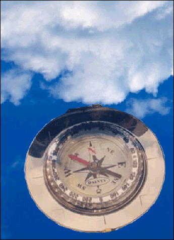 Создадим коллаж, в состав которого входит поверхность со стеклянным покрытием, которое, при определенных условиях освещения, может давать зеркальное отражение. В качестве примера воспользуемся изображением, показанным на рис. 6.86. Оно состоит из двух слоев: на верхнем расположено изображение компаса, нижний слой занимает картинка неба. Расположение объектов композиции таково, что обязано порождать зеркальное отражение облаков на стеклянной крышке компаса. Начнем создание коллажа с создания этого отражения.