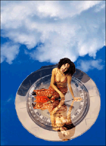 5. Предыдущими операциями основная техника создания зеркальных отражений представлена с достаточной полнотой и в принципе на этом можно закончить раздел. Но сцена выглядит пустоватой, поэтому усложним задачу и введем в состав коллажа еще один персонаж. Поставим на самый верх композиции слой с изображением девушки (рис. 6.89.).