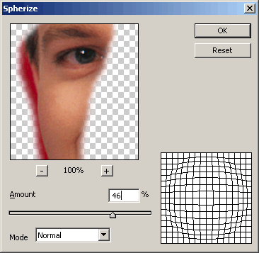 3. Запустим фильтр по команде Filter => Distort => Spherize (Фильтр => Искажение => Сферизация). Подберем такое значение параметра