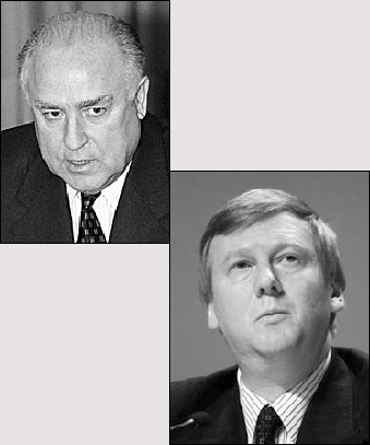 Рассмотрим относительно простой случай, когда пересадка волос не связана жесткими требованиями соответствия оригиналу, а выполняется для получения некоторого художественного эффекта. Этот случай часто встречается в коллажах и фотомонтажах политической периодики. Возьмем в качестве примера фотографии двух известных фигурантов российской политической сцены (рис. 6.135).