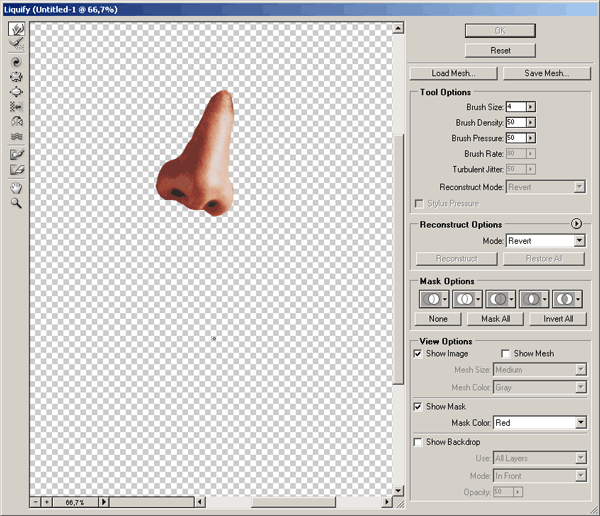 2. Для обработки носа применим более сложное средство - команду Liquify (Плавить). Полное описание этого мощного, обладающего множеством настроек инструмента можно уложить разве что в отдельный раздел. Рассмотрим общую схему обработки, поскольку для получения удовлетворительного результата в любом случае потребуются многочисленные пробы и эксперименты с настройками. Создадим выделение области носа и перенесем этот фрагмент на отдельный слой. Применим к этому слою команду