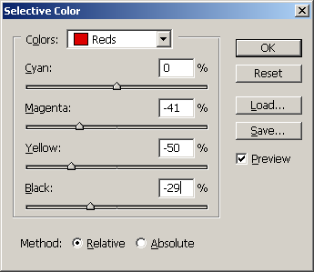 Selective Color. He снимая ранее созданной пометки, выполним команду главного меню Image => Adjustments => Selective Color и уменьшим интенсивность красок в составе красного цвета. Примерное значение настроек показано на Рис. 6.145. Снимем выделение (Ctrl+D).